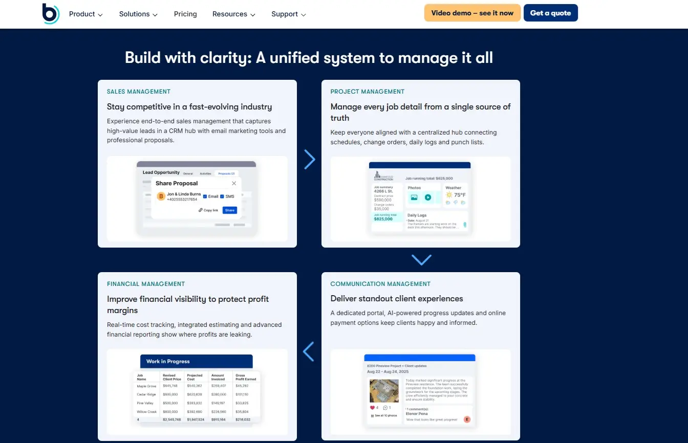 Web-based project & task management, client communication portal, scheduling & budgeting, suitable for small/medium contractors